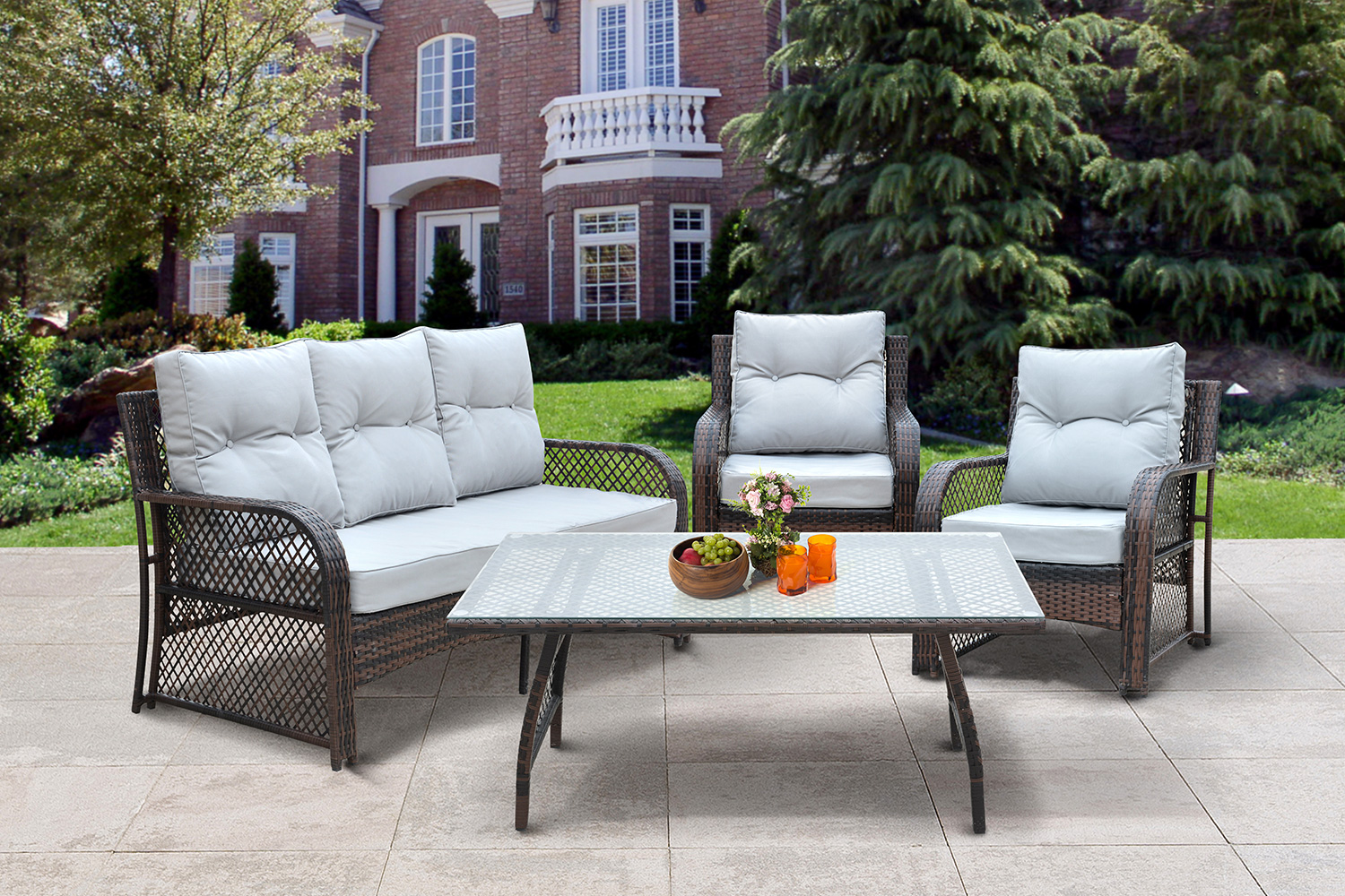 Внешний вид готового изделия: набор состоит из 4 элементов мебели, но каждая из них состоит из стального каркаса, оплетенного искусственным ротангом. Переплетение оплетки достаточно редкое (видны просветы), но при этом оно прочно сохраняет свою форму, и не портиться от жары, влаги, или палящего солнца. Сверху столика уложено закаленное стекло, которое выдерживает до 25 кг.